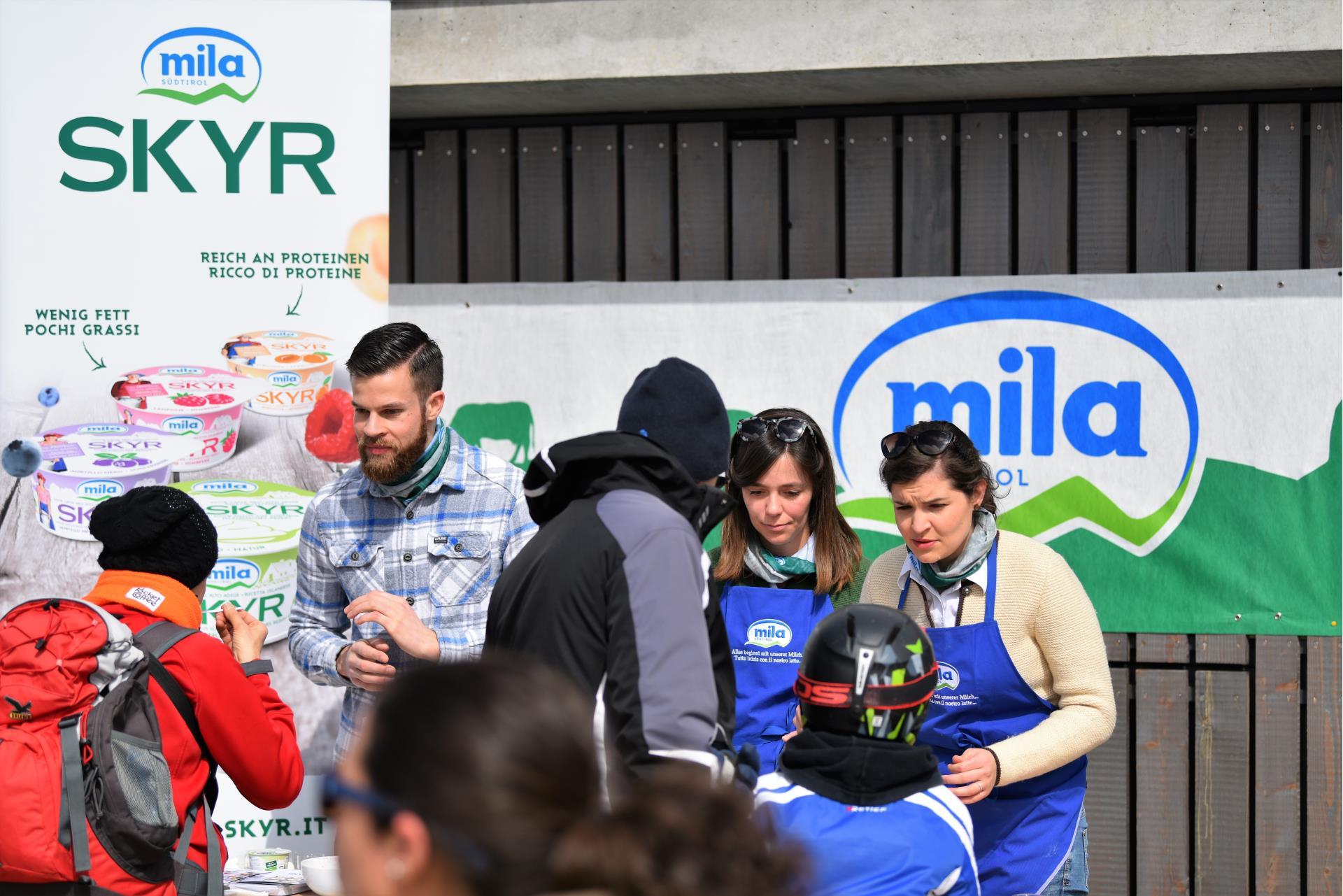 Mila Skyr Day | Oberholz | Obereggen Der Mila Skyr Day am 24. März auf der Berghütte Oberholz im Skigebiet Obereggen war ein kulinarischer Hochgenuss im wahrsten Sinne des Wortes. Auf 2096 Metern Meereshöhe wurden Skyr-Variationen serviert und das Milchprodukt konnte nach Lust und Laune verkostet werden. Der Kalterer Foodblogger und Botschafter des Mila Skyr Stefano Cavada (über 1,5 Millionen Videoaufrufe, über 18.000 Abonnenten auf YouTube und eigene Kochshow im TV-Sender La7d) bereitete für alle hungrigen Gäste einen Gruß aus der Küche zu, bei dem Spargel, geröstete Quinoa und Skyr eine genussvolle Einheit bildeten. Außerdem hat er gemeinsam mit Franz Rungger, dem Küchenchef der Oberholz und wir von Mila – Bergmilch Südtirol eine ganz besondere neue Speise kreiert, die als Tagesgericht erhältlich war: einen Risotto von der Obereggener Latschenkiefer mit Mila Skyr und Geräuchertem vom Rind. Viele Interessierte haben außerdem am eigens für den Skyr Day vorbereiteten Verkostungsstand den Mila Skyr in den vier verschiedenen Geschmacksrichtungen Natur, Himbeere, Heidelbeere und Aprikose probiert. Mila Skyr ist eine Milchspezialität, deren ursprüngliche Rezeptur aus Island stammt. Dort hat Skyr eine sehr lange Tradition. Mit 100% Milch aus den Südtiroler Bergen und ausgewählten Zutaten bieten wir Mila Skyr als besonders proteinreiches und fettarmes Milchprodukt an. Dank seines hohen Protein- und des niedrigen Fettgehalts sind besonders ernährungsbewusste und sportlich aktive Menschen von Mila Skyr begeistert. Durch den vollmundigen und feinen Geschmack ist Mila Skyr auch bei allen Joghurtliebhaben – ob Jung oder Alt – beliebt.