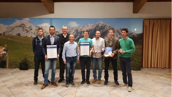 Bei der Verleihung in Österreich dabei waren (v.l.n.r.): Markus Schmidhammer (Mitarbeiter Mascarpone), Stefan Breitenberger (Produktmanager Käse), Joachim Reinalter (Obmann Mila – Bergmilch Südtirol), Ludwig Tschurtschenthaler (Käsemeister), Sebastian Mairegger (Mitarbeiter Käserei), Pliger Othmar (Mitarbeiter Käserei), Johannes Unterkircher (Mitarbeiter Käserei), Georg Schwingshackl (Mitarbeiter Mascarpone)